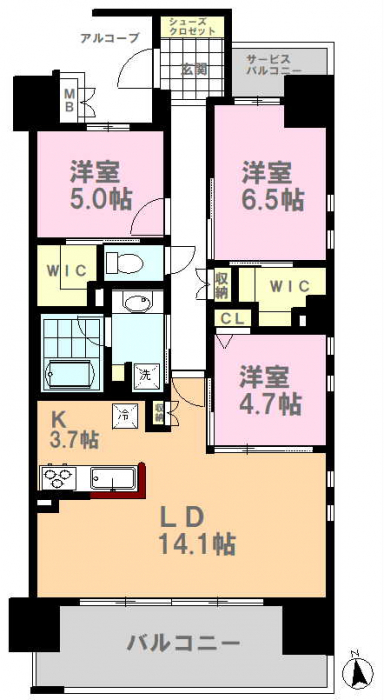 全ての部屋がバルコニーに面した、光と風が通り抜ける開放的な設計。L字型に広がるワイドなスペースは、リビングの延長として、空を間近に感じる心地よい屋外リビングを演出します。