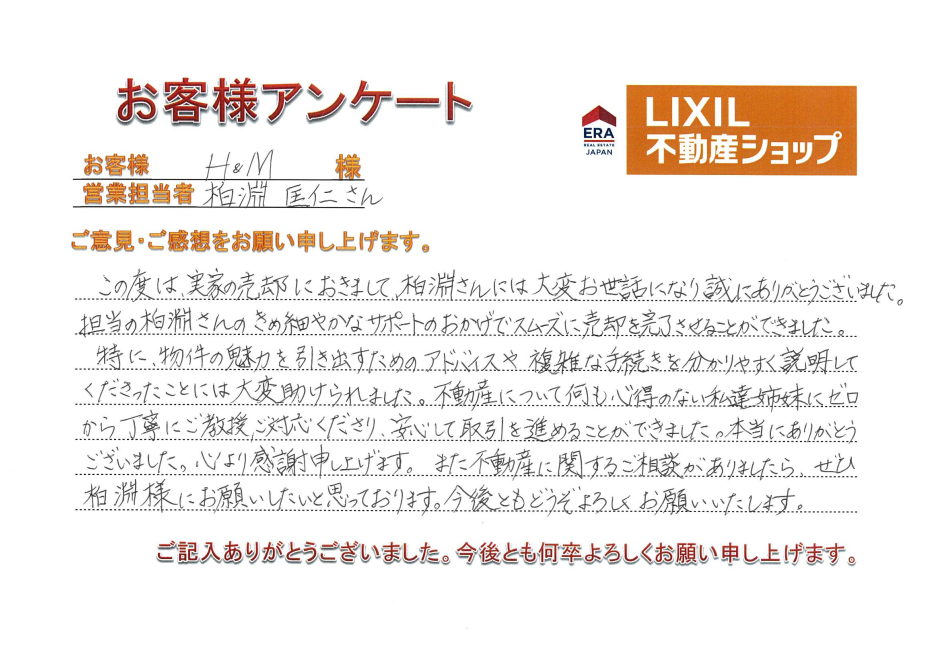 この度は実家の売却におきまして、柏淵さんには大変お世話になり誠にありがとうございました。