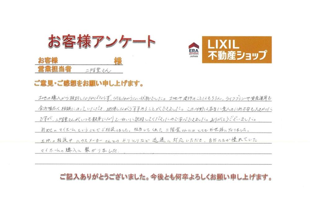 初めてのマイホームということでご相談しました。担当してくれた二階堂さんにはとてもお世話になりました。土地の相談やハウスメーカーさんとのやりとりなど迅速に対応いただき、自分たちが憧れていたマイホームの購入に繋がりました。(ご主人様)