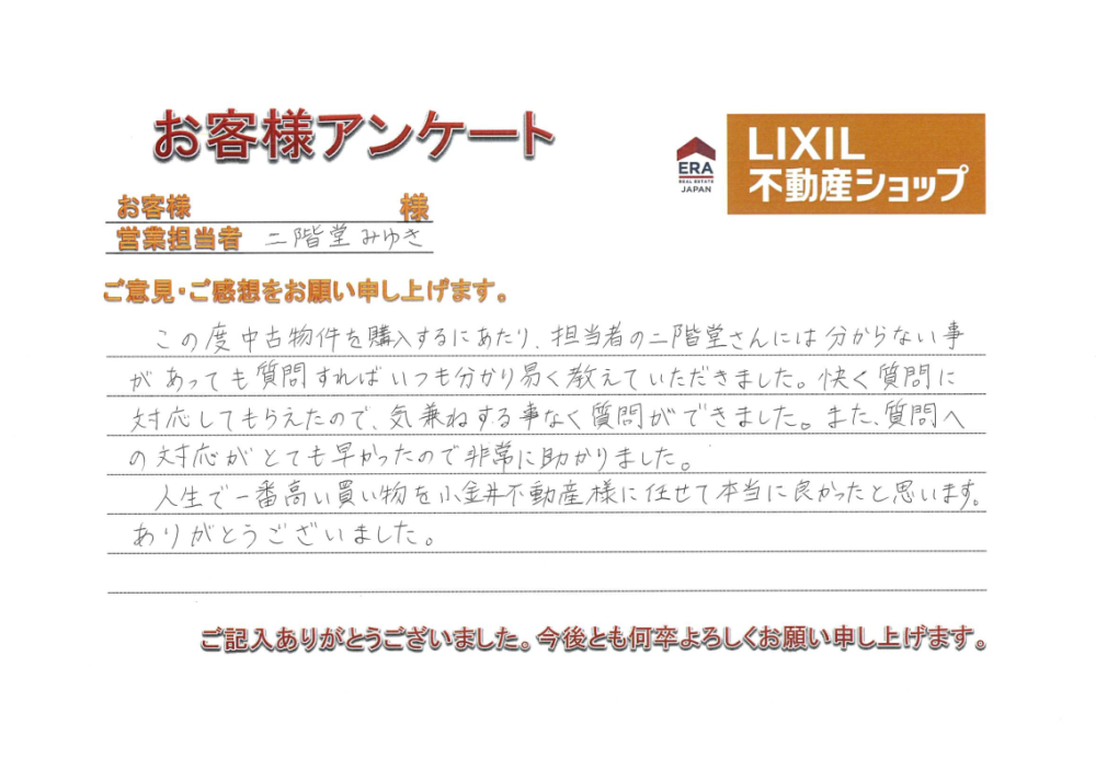 (担当者:二階堂 みゆき)小金井不動産をお選びいただき、誠にありがとうございました。