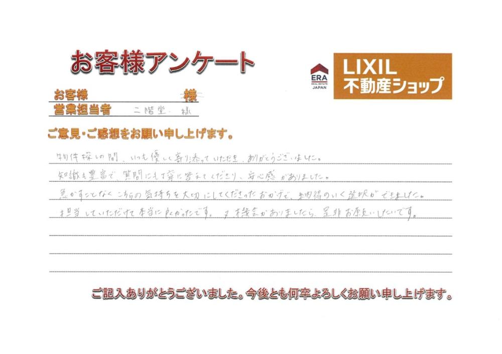 (担当者:二階堂 みゆき)物件探しからお引き渡しに至るまで、ご協力的に動いてくださったことで、スムーズに進めることができました。