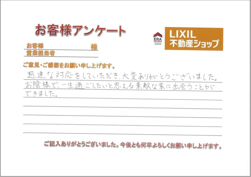 (担当者:大橋 儀史彦)一生過ごしたいと思える家に出会えた」というお言葉を伺い、私自身、自分のことのように嬉しく、胸が熱くなる思いです。新しい門出に微力ながらお力添えできたこと、この仕事をしていて本当に良かったと実感しております。