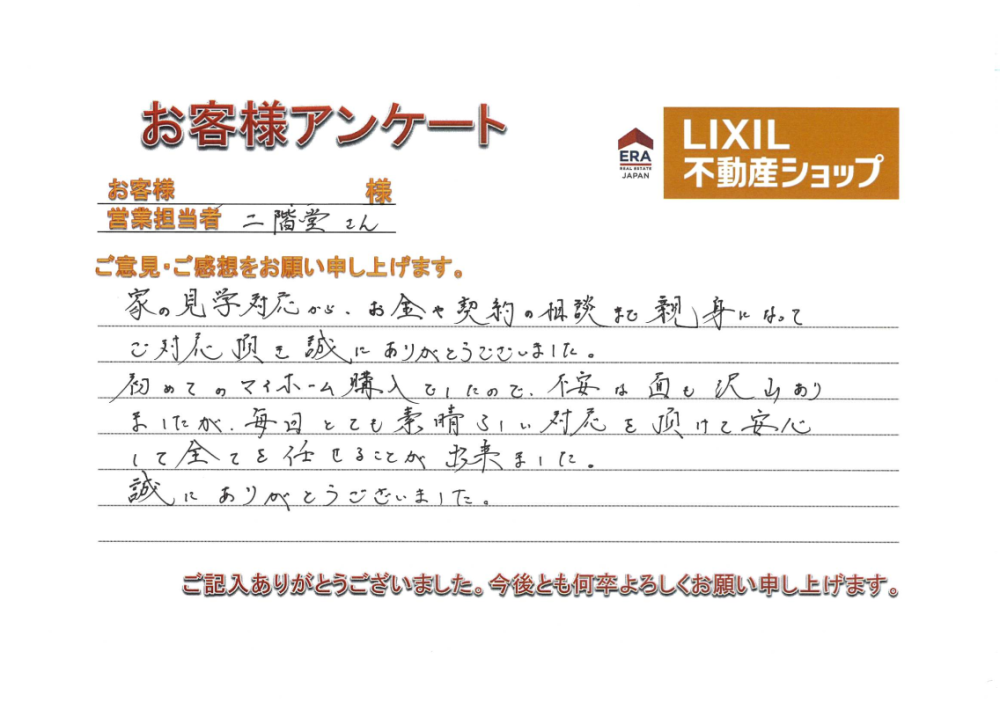 お引き渡しまであっという間でしたが、お手続きの都度すぐにご対応いただけたことで、お引き渡しまでスムーズに進めることが出来ました。本当にありがとうございました。